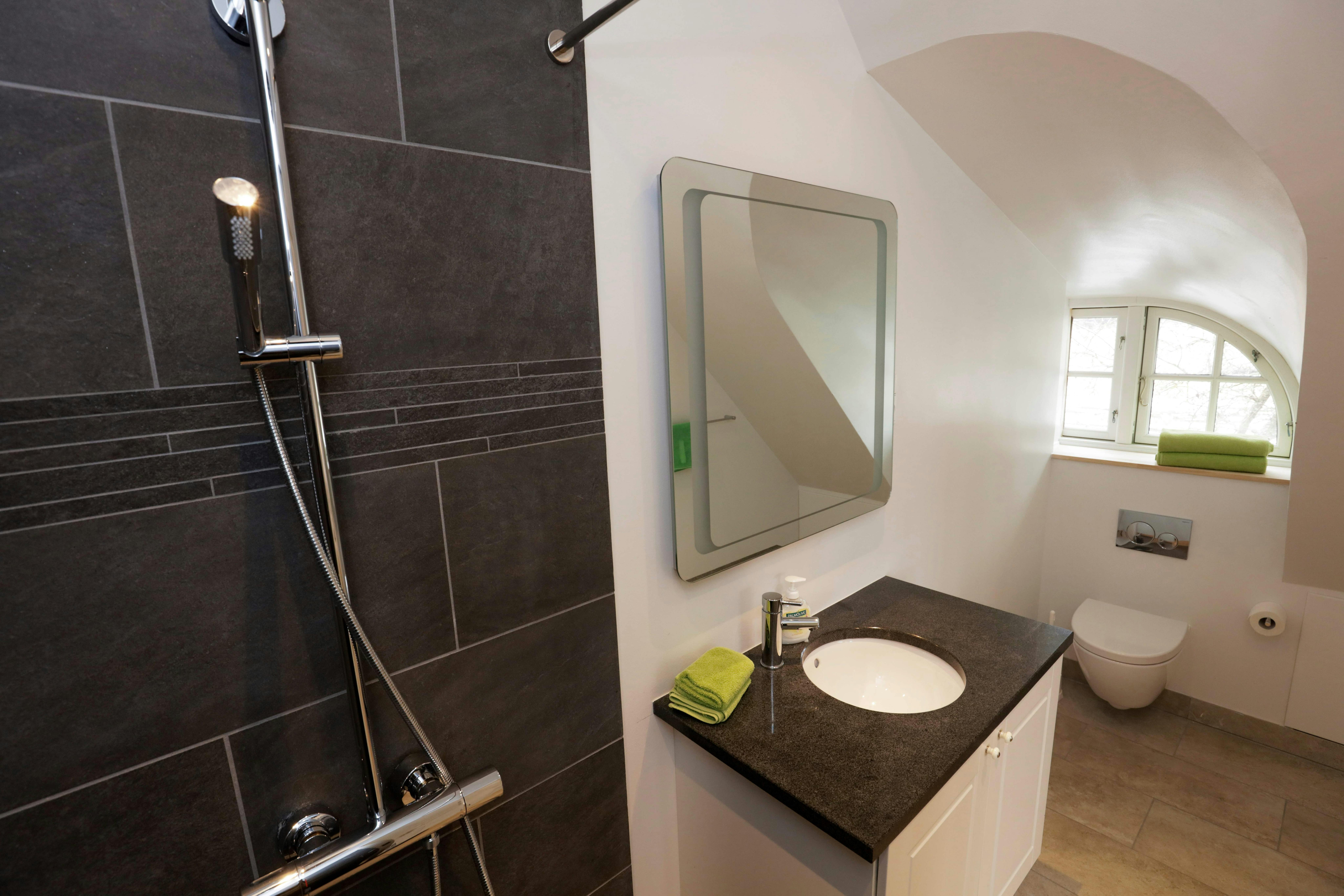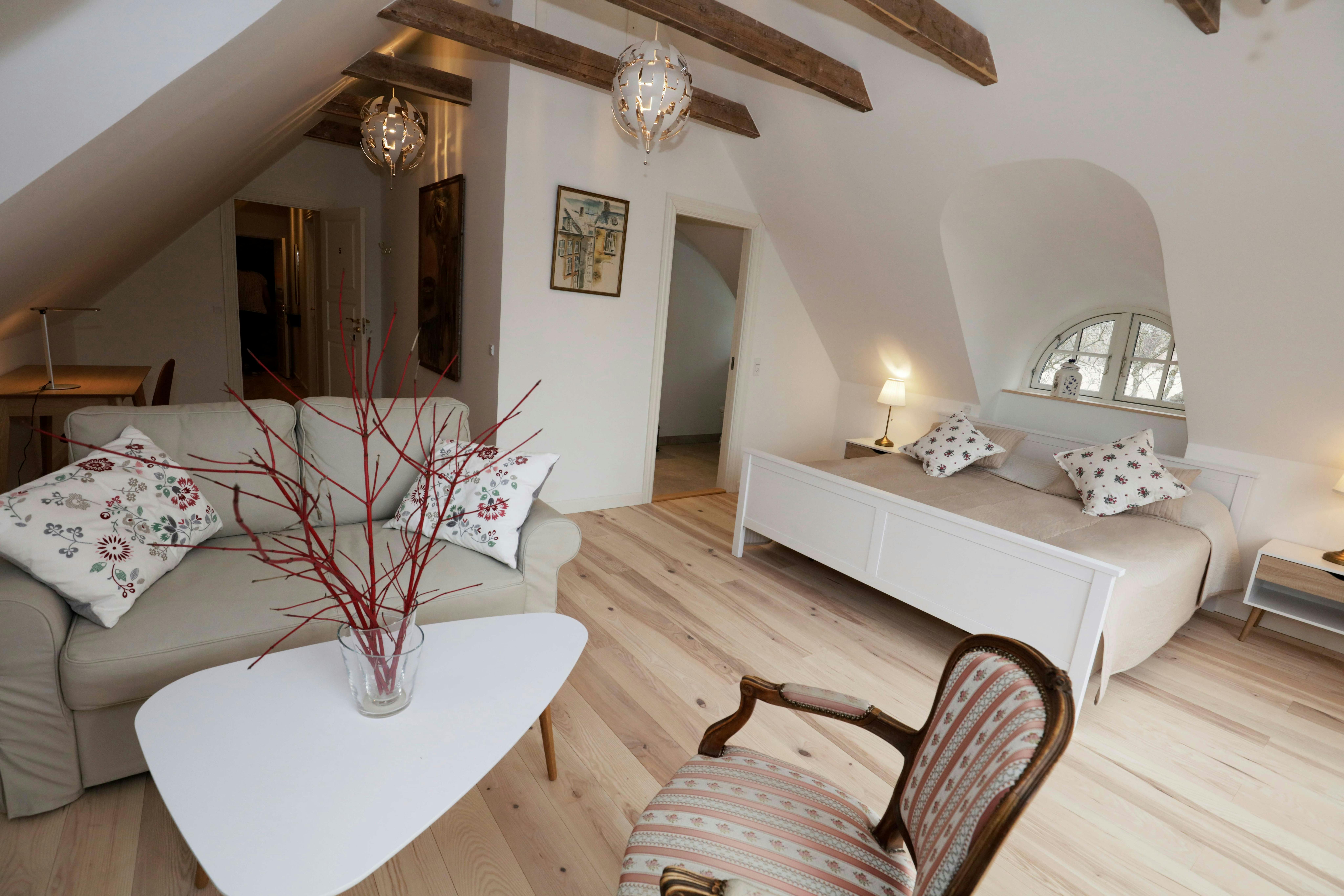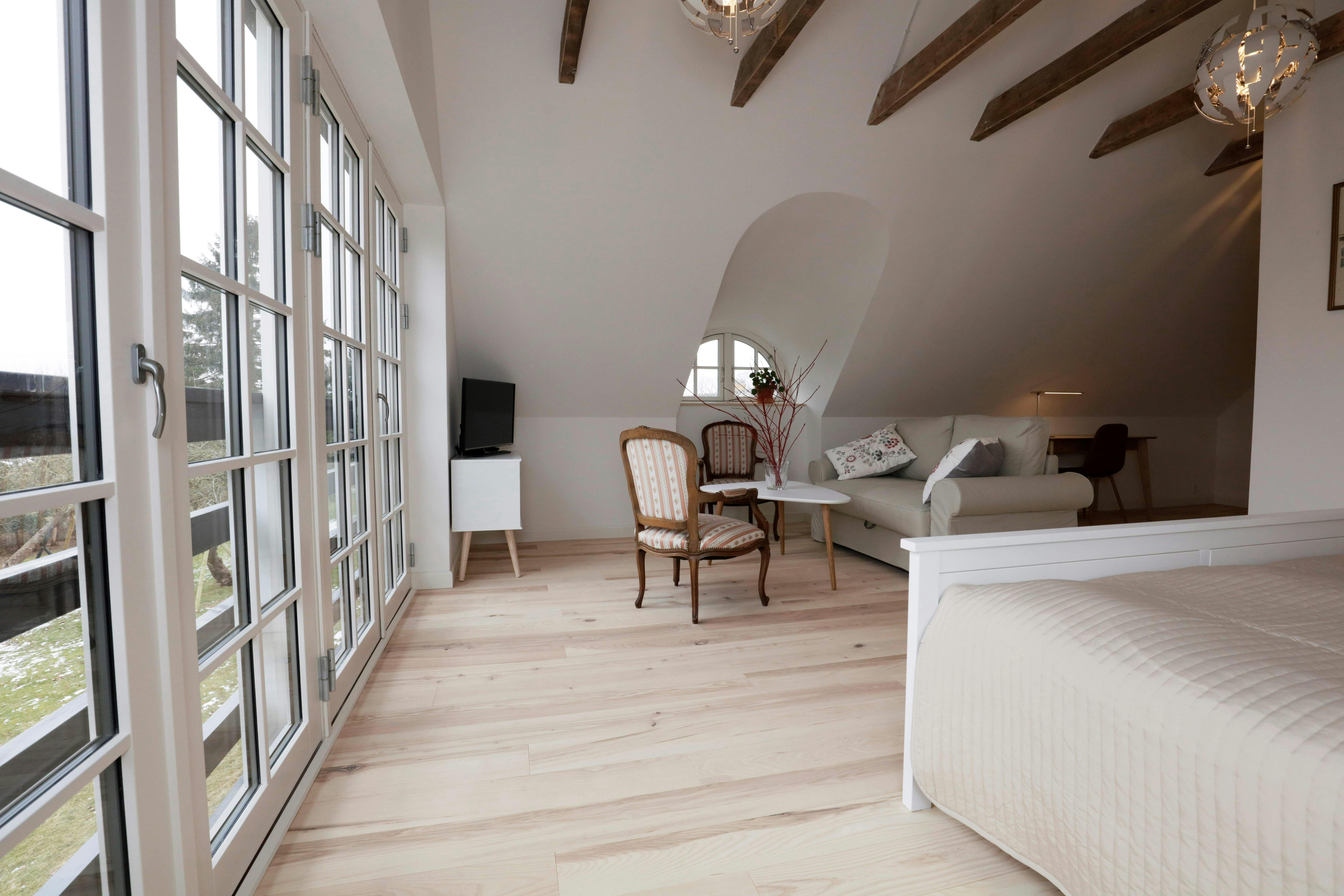 Honeymoon suite on the first floor, bath en suite, sitting area and balcony with a view to forest, fields and surrounding area.